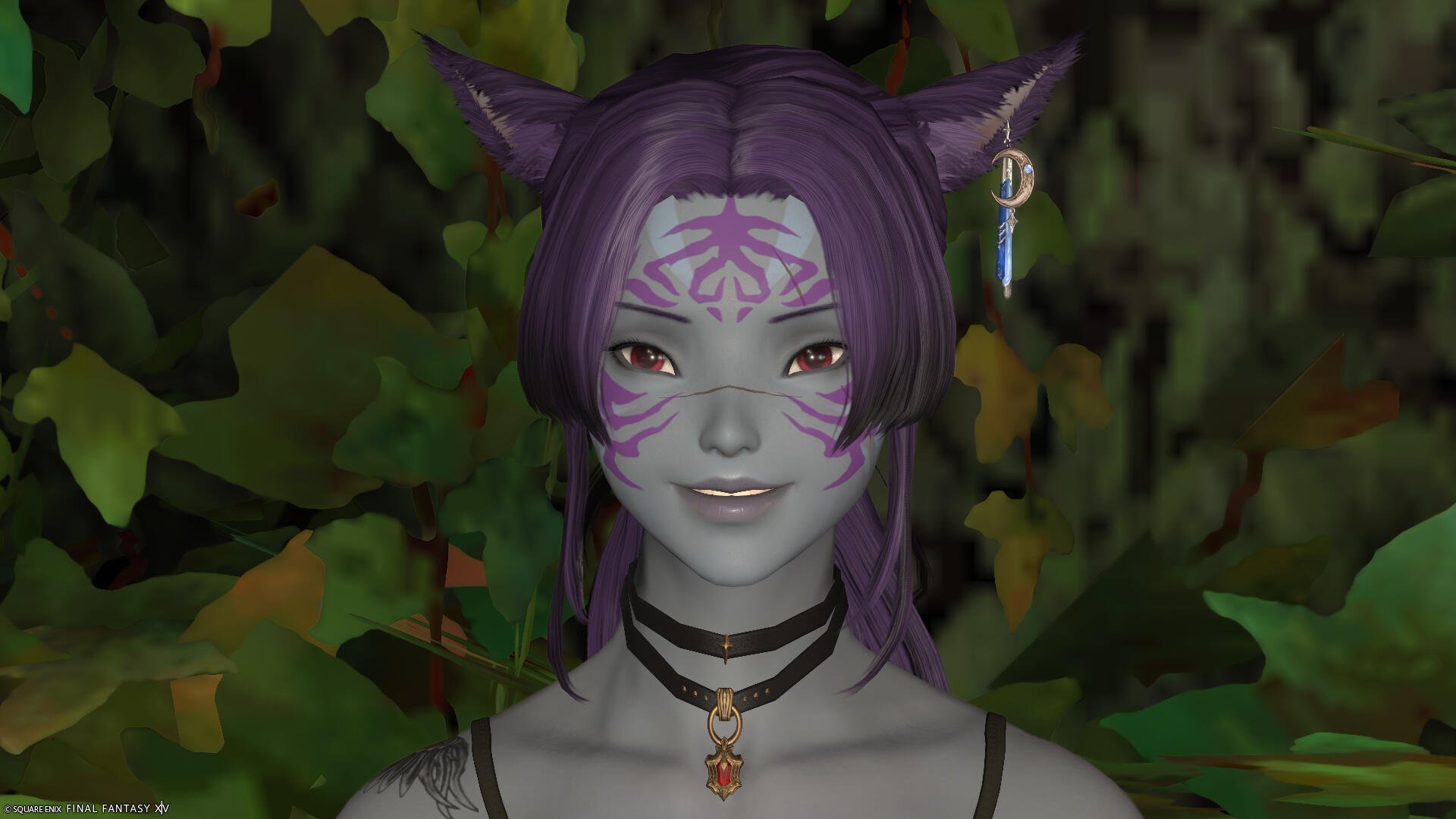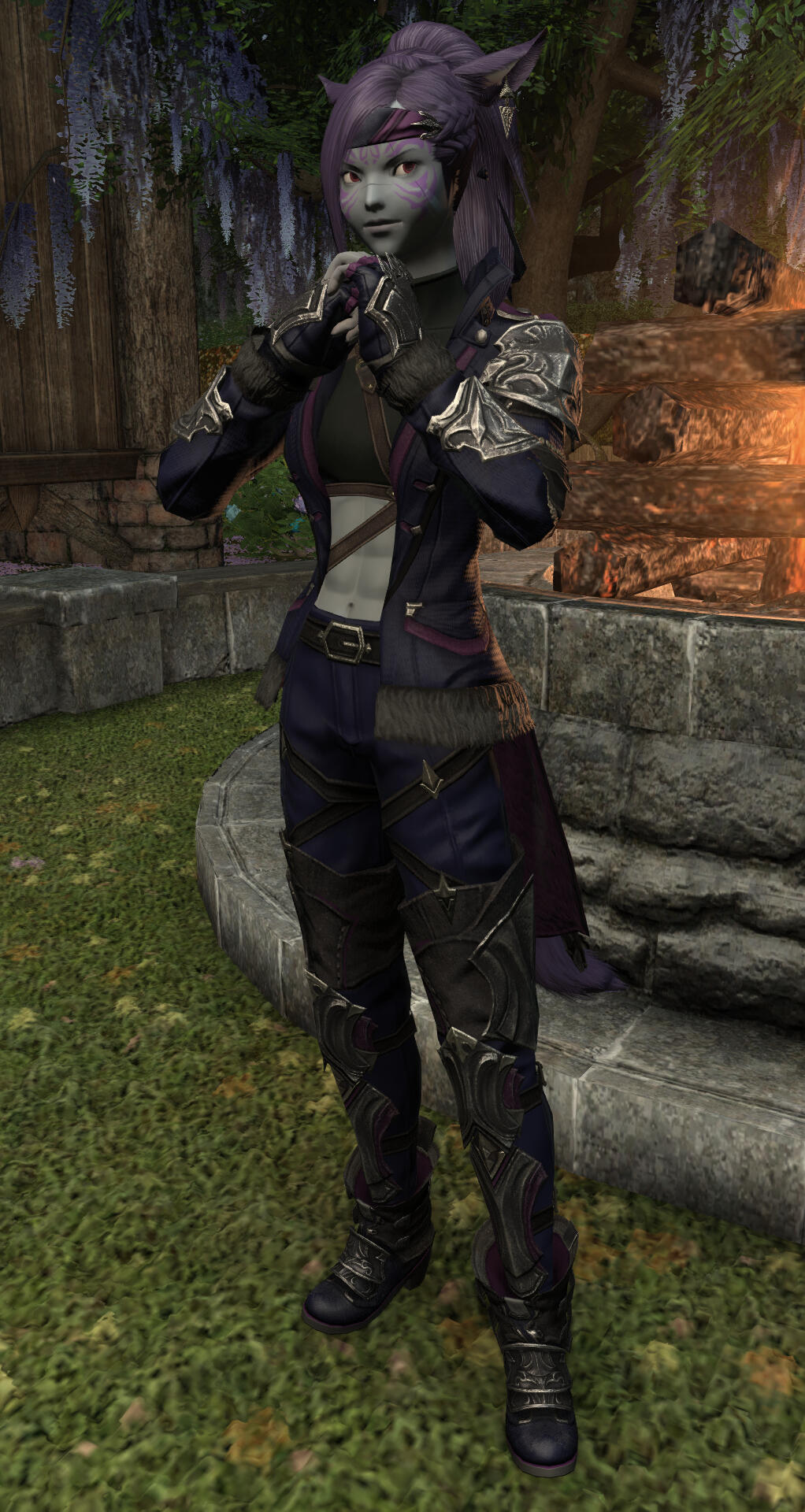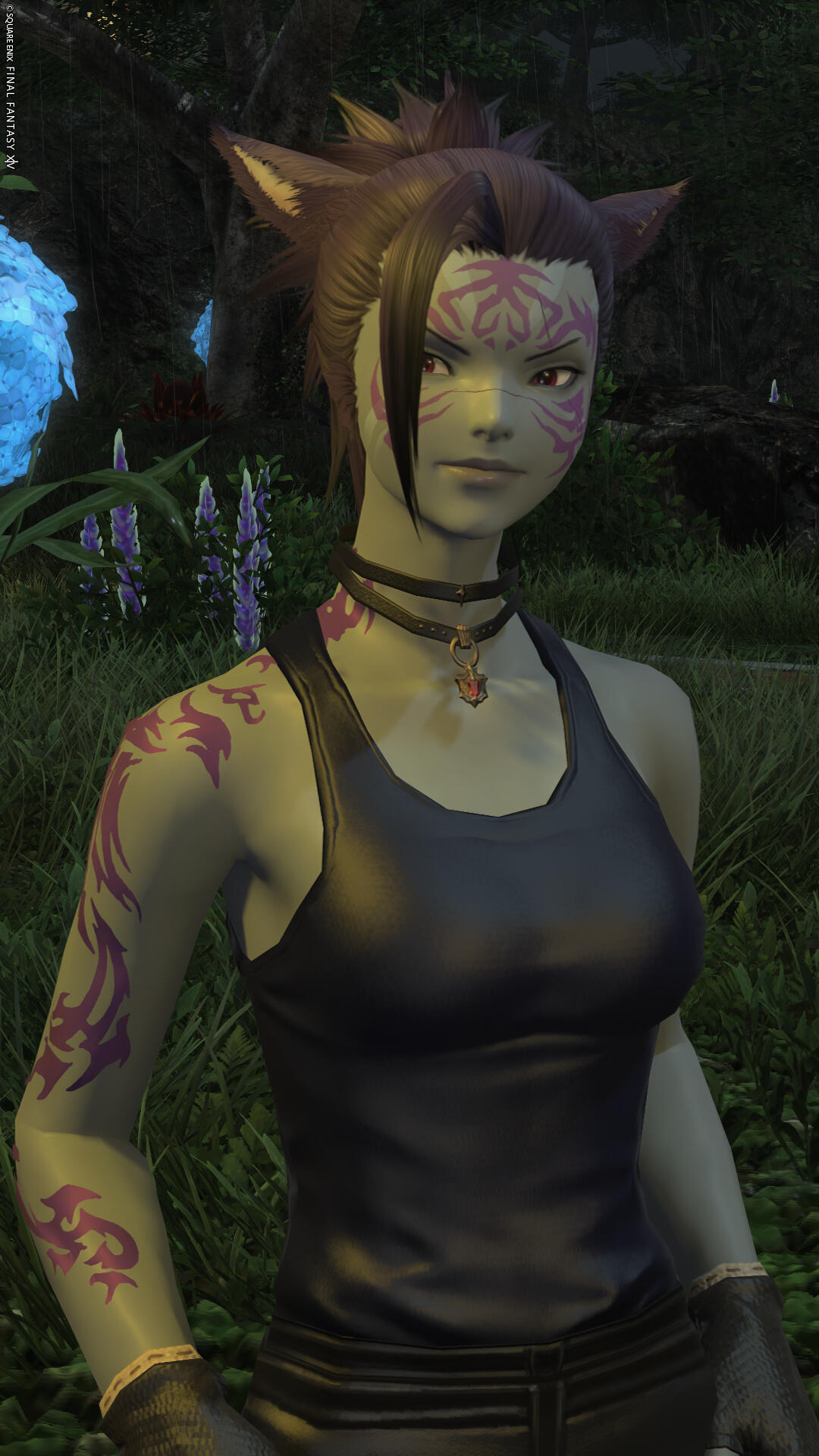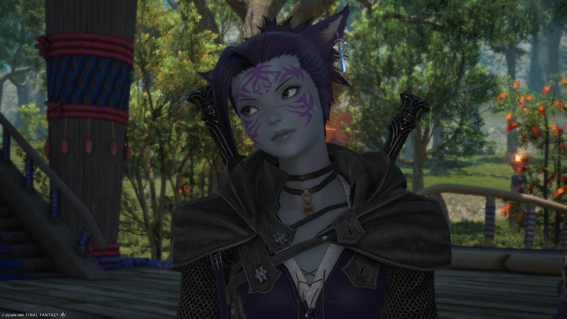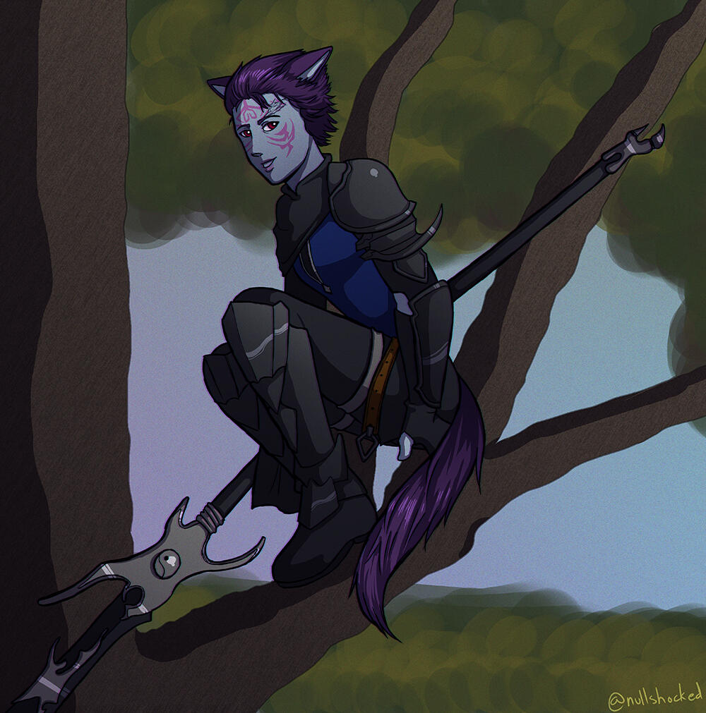 Post Calamity Past: The Shroud The last thing she remembered was looking out of a window in the Twelveswoods with a sense of amazement and terror as she gazed upon the moon which was so close to the world. Then it exploded, sending fragments in all directions. A voice behind her screamed out the name “Saeber” but before she could turn around, she was thrown through the air. There was light and heat; then there was nothing. The first thing she remembered was the throbbing pain in her head. Then, as the rest of her senses awoke, she felt the heat of the fire and smoke filling her lungs. As the flames began to sear the skin on her back, instinct took hold, forcing her to get up and get away. Her body racked in pain she pushed herself to run away from the devastation. She had no idea how long before her injuries took their toll and she collapsed once more into darkness. As she woke sometime later, her head still throbbed, the left side of her face felt slick with blood, and she could barely see out of the eye as it was swelling shut. She dragged herself to a nearby pond, and fear filled her heart when she did not recognize the person staring back at her. All she could remember was a voice calling out “Saeber”. Confused, afraid, and alone she wandered deeper into The Black Shroud with only the vague sense of fear pushing her away from the crater that was once her home. It was not long until Saeber’s body gave out on her once more and she collapsed. Thinking it was the end she let herself fall asleep, for what she thought would be the last time. The next few weeks were completely lost to her, all she could remember was waking up from time to time, feeling like she was moving, and a constant look of a very worried, black haired Miqo’te with azure eyes. It wasn’t until she fully regained consciousness, she started to realize what had happen. The other Miqo’te’s name was Kihvah and she had found Saeber on death’s door. She had treated Saeber’s wounds and cared for her, and she continued to do so for several moons until Saeber’s body had healed enough. Saeber learned that Kihvah was a member of another group of Keepers that lived in the South Shroud, a group named the Coeurlclaws. Kihvah never said much about them but did promise that when Saeber was ready she would bring her to them, so she would have a home. For about a cycle after the Calamity Kihvah cared for Saeber as they became very close friends. Kihvah taught her how to track and hunt, and how to fight with a lance. She would disappear for days, saying she was going back to get supplies and to check up on the rest of the Coreulclaws. One evening, when Kihvah returned, she returned with a ‘gift’ for Saeber, her own Coreulclaw mask. This was the night where Saeber’s life changed for the second time. This was the night she learned who the Coreulclaws were, in particular who the ‘King’ was. Saeber wanted no part of it, and ran, fear and uncertainty gripped her heart. For a sun they hunted her through the southern part of the Shroud, but only one was able to find her, Kihvah. The two fought, and somehow Saeber was able to win the battle, killing her former teacher and friend. Devastated by the betrayal she disappeared into The Shroud. Saeber roamed the forest doing what she could to survive. After what Kihvah had done to her, she was afraid to trust anyone else and was paranoid that anyone who saw her, could just be another Coreulclaw, looking to take her back, or avenge the death of Kihvah. She struck out alone finding, hunting, or stealing food when she could and sheltered in caves and trees away from people. It was only recently, cycles after The Calamity that robbed her of her past, that the questions of who she was started to overcome her fears. So, she headed towards Gridania; perhaps there someone would recognize her, or she could find some clue to her lost memories.