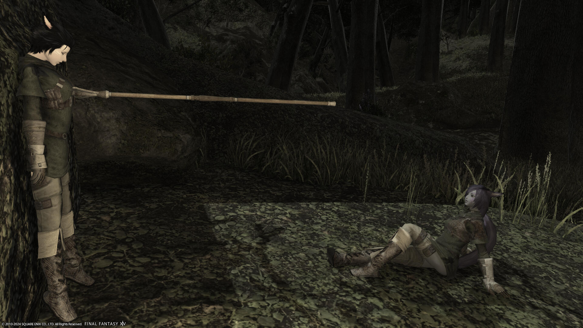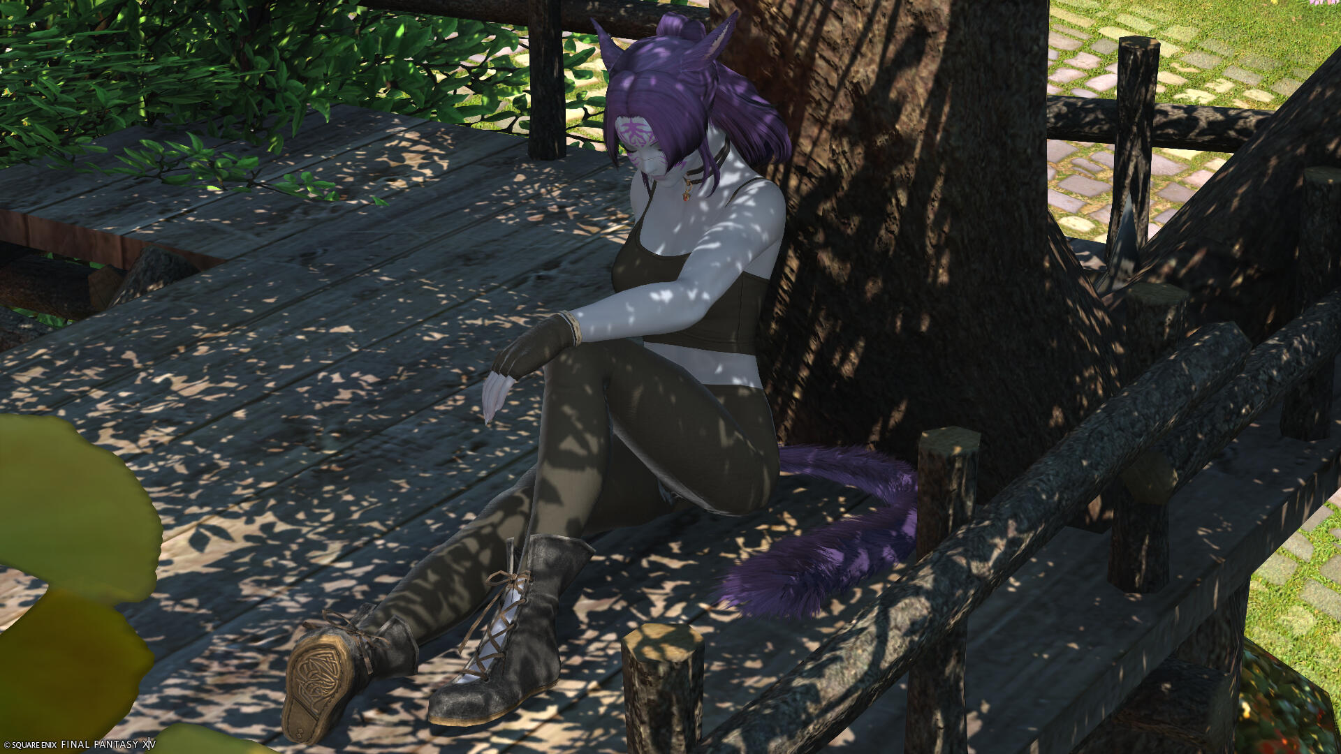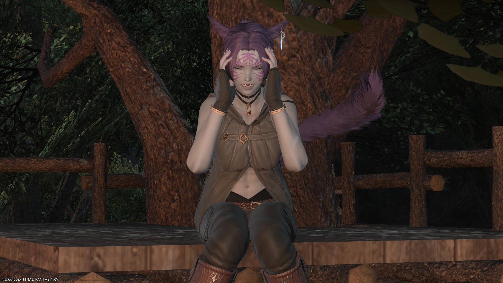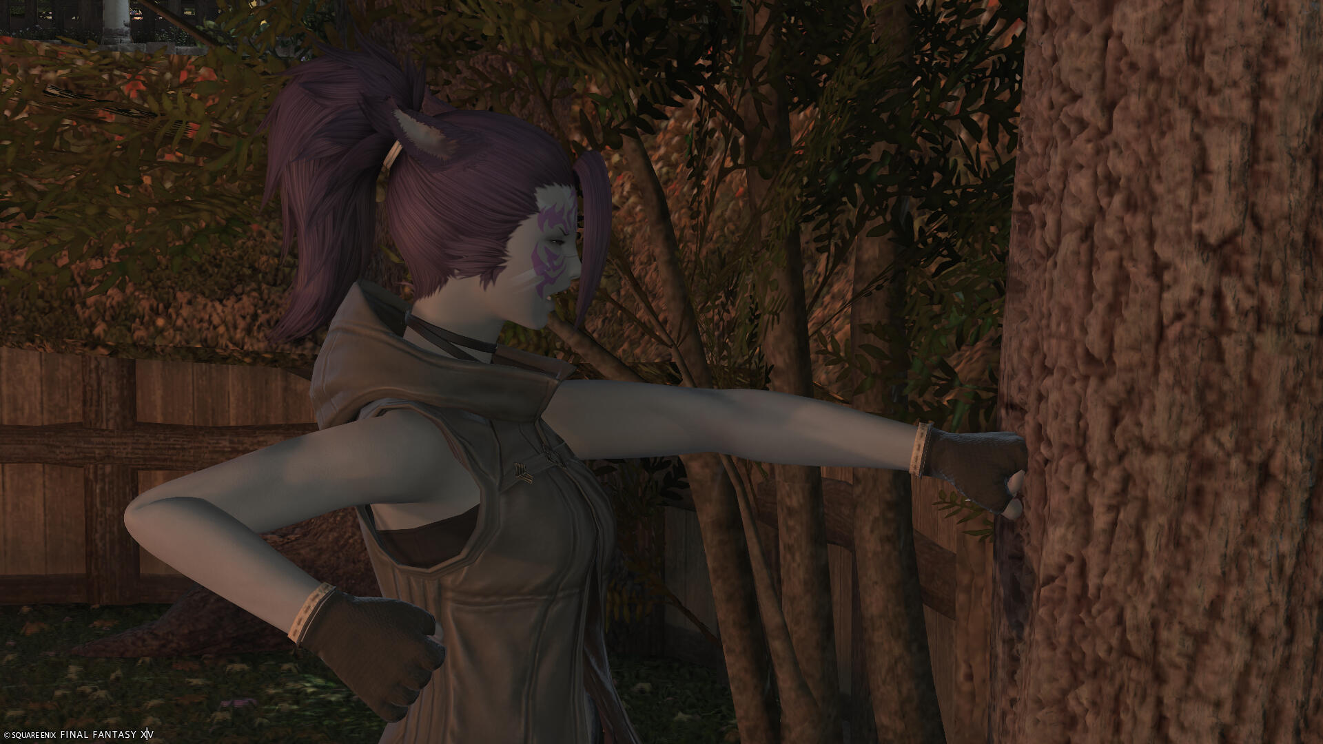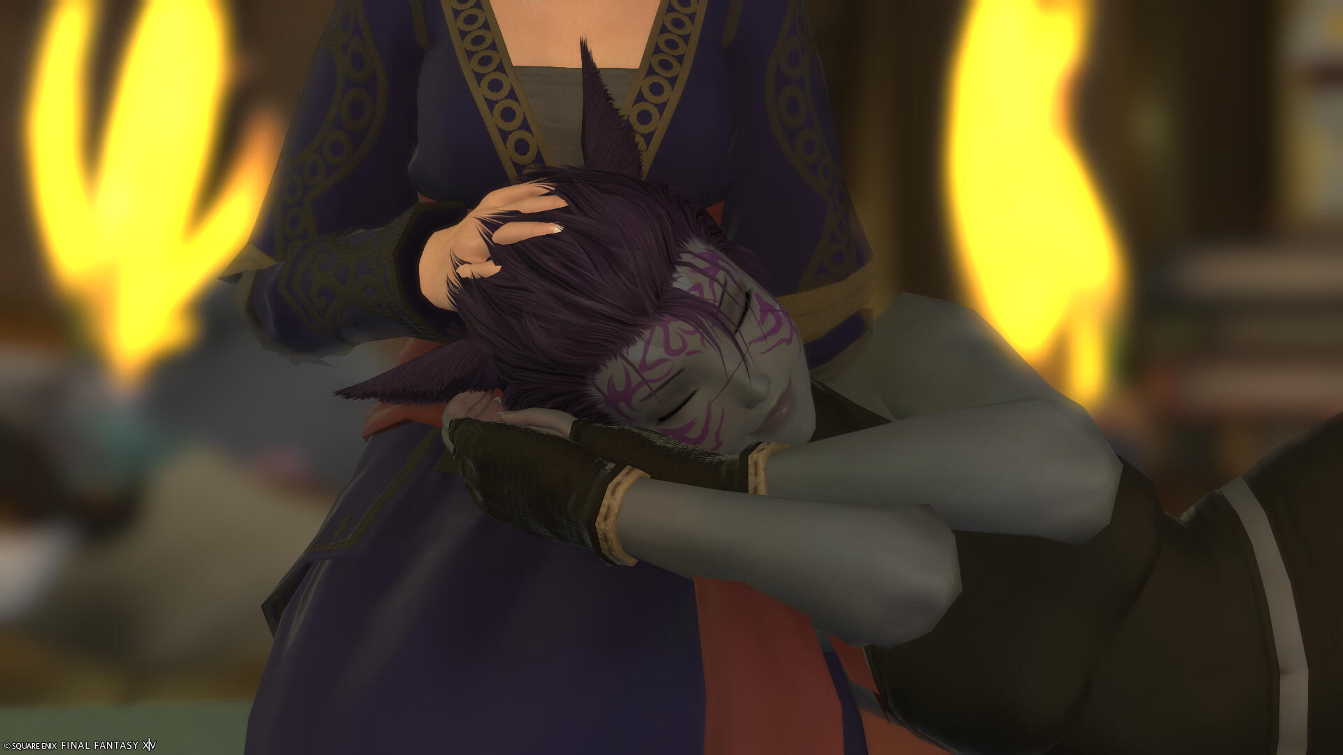 Unforgotten They were all giants around her. Saeber’s crimson eyes were wide watching the scene before her. On one side of the desert field was the priestess and the swordman, ripping each other apart. The blood that soaked the ground was slowly creeping towards her. On the other side of the field, the monk and the mage held their titanic duel. The ground ripped asunder, holding the monk in the sky, ice and fire whipping around them all. Between the combatants and Saeber were all the others. Friends, companions, and strangers alike – all cheering on the carnage in front of them - parted just enough she could watch it unfold. Her eyes darted between the two battles, her mind barely able to follow what was happening before her, let alone comprehend it. They just continued, and grew larger, while she grew smaller. Finally, as the blood-soaked ground reached her feet, hands reached out and gripped her ankles. As she tried to pull away, she noticed the crowd parting and the monk held high above them, turning towards Saeber. With a cruel smile he raised his glowing hand and let loose the aether stored within him, the beam of light flew towards the captive Miqo’te. The white light turned red, like the fires of Dalamud, before it reached her. With a scream, she reflexively grabbed the stock of her lance and brought it in front of her as she sat up. Gulping for air, face slick with sweat, she prepared for the end that never came. Slowly her eyes opened, and she found herself staring at the clan house in front of her. A few deep breaths later, she dropped the lance to the floor of the tree stand she was sleeping in and pushed back to lean against the trunk of the tree. After a few more moments as she felt the adrenaline fade from her system and pushed herself to her feet. Looking upwards to the sky she sighed heavily, still several bells before dawn. “Why am I here?” she spoke softly to herself as her gaze fell upon the house once more. With a sigh she leaned down to pick her lance back up and slung it over her shoulder. Quietly she descended the ladder of the tree stand. With one last glance at the house, she pulled the linkshell out of her ear and slipped it into a pouch before heading down the flight of stairs to the road. For several bells she wandered the roads and trails of the Shroud, letting her feet take her in whatever direction they chose. Her mind was lost in the turmoil, replaying over-and-over in her head what she saw that day. How she couldn’t do anything but step away in fear. How useless she would have been if her friends needed her. She didn’t even know how to give her aether to those who could even do something useful with it. To make matters worse, they were just duels, if it was a real battle, she probably would have gotten one of her friends killed trying to protect her rather than helping. Every step she took, every time she tried to figure out what she could do different, she grew more frustrated and angrier. As her anger turned into rage she struck out, punching a nearby tree. The sudden pain in her hand helping bring her back to reality and to where she was now, deep in the southern region of the Shroud. Her anger faded and an ache rose in her chest as her eyes slipped down, seeing a cycles old scar, as something had cut deep into the flesh of the tree. With a trembling breath, one word slipped from Saeber’s lips, “Kihvah.” Stepping back from the tree, Saeber’s heel caught a root, causing her to uncharacteristically fall to the ground. She looked up at the tree and blinked as flashes of another Keeper with short black hair, impaled to a tree by a lance, life fading from her azure eyes seemed to appear before her. “No. Kihvah. I’m sorry,” she said silently as she crawled backwards, the past and the present overlapping. In the past her hand, landed on top of a Coeurclaw mask, cracked and covered in blood - though in the present there was nothing there, only her fingers still curl around air. “I’m sorry, I’m sorry, I’m sorry,” She repeated over-and- over again until the past and present diverge, with her past-self running away. With a groan she pushed herself back to her feet, rubbing her eyes, as she forced herself to focus on the present once more. With a large sigh she reached down to her side and opened the pouch that was there and pulled out the mask, leaving another smaller, but intact one inside. Slowly, Saeber turned the mask in her hands as she walked up to the tree. For a few moments, her eyes stared at it before she reached out to loosen a strip of bark, large enough that she could hang the mask from it. Taking a step back she sat on the ground and looked up at the mask tilting her head slightly. “Hi Kihvah…been long time hasn’t it?” Leaning back placing her hands on the ground behind her she continued to look up at the mask. “Sorry I haven’t been around. Not since…well you know. Don’t know why I’m here now, talking to an old broken mask…” With another deep breath she shook her head. “Found some people…in way a lot like you…or at least what I thought you were like. Well, you were like…till you took me to him.” Saeber’s ears flattened and her tail thumped hard on the ground at the very thought. “They…especially one, they helped me…not as afraid anymore…well least I wasn’t, not since a couple days ago.” With a heavy sigh Saeber shifted her weight forward and crossed her legs, before leaning forward and resting her arms on them. “Went to this gathering, were duels. What saw there. Just don’t know how to explain. There was this energy in the air, but so intense. Couldn’t do anything. If something happened…would be putting them at risk.” Another heavy sigh as she looked down at the ground in front of her. “I’m sorry…not even you…at least what showed me could compare to any of them. Still don’t know how I…how I…” Her eyes lifted, tears filling the edges as she l